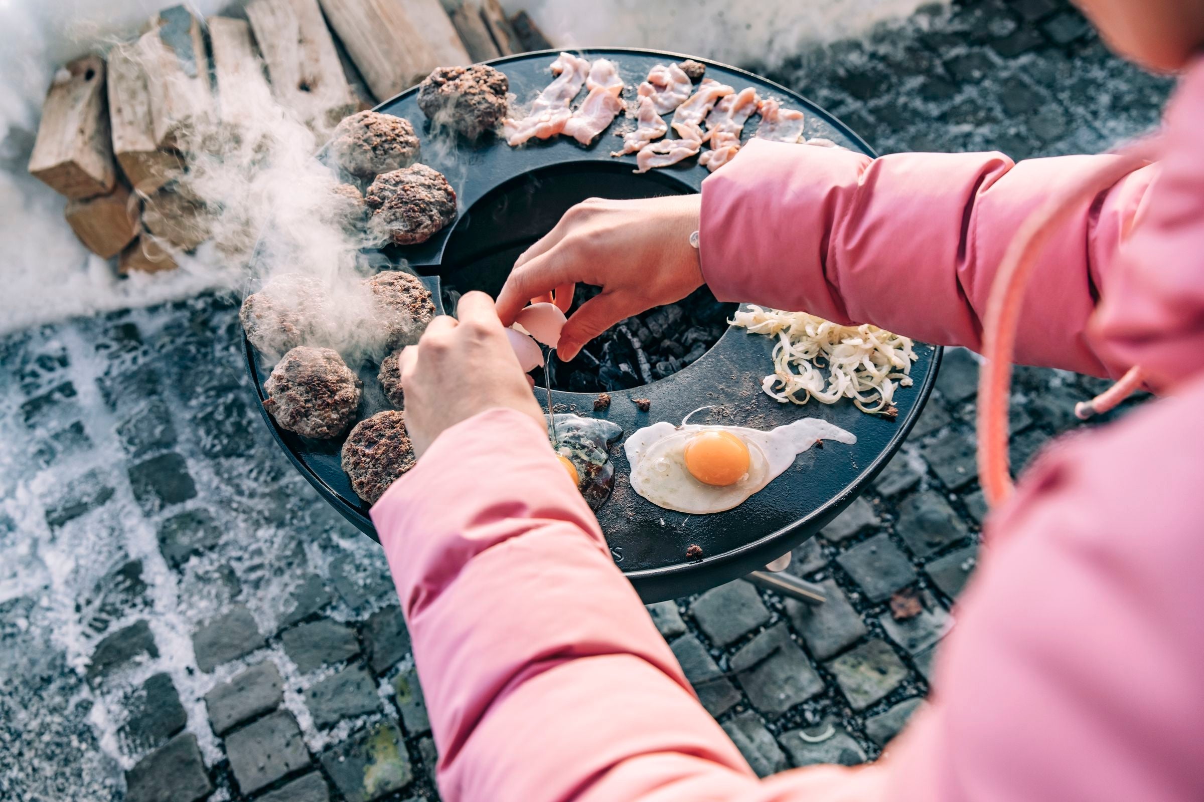 De plancha van Höfats maakt van de Bowl vuurschaal in een handomdraai een buitenfornuis. Net als de vuurschaal is de plancha gemaakt van geëmailleerd staal.