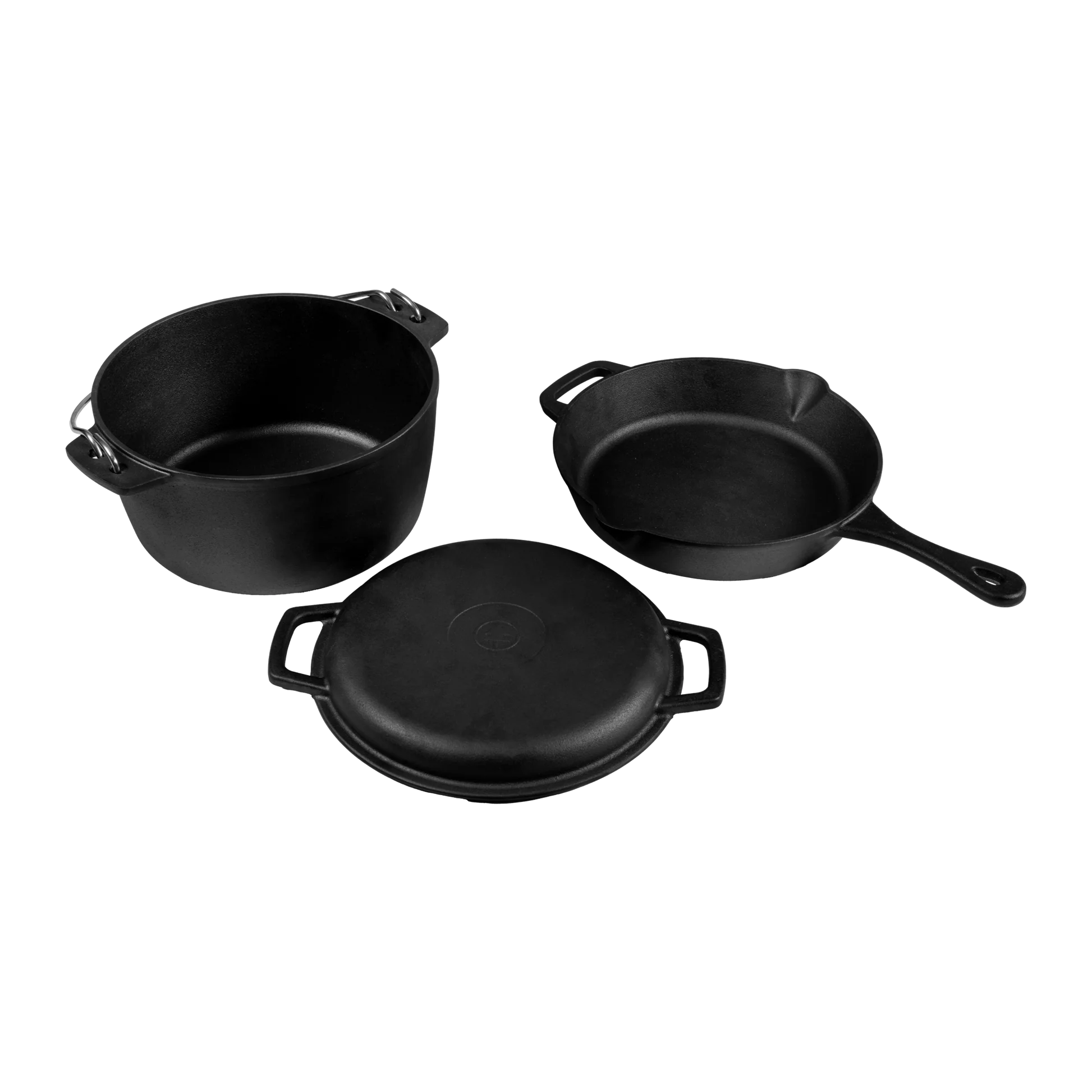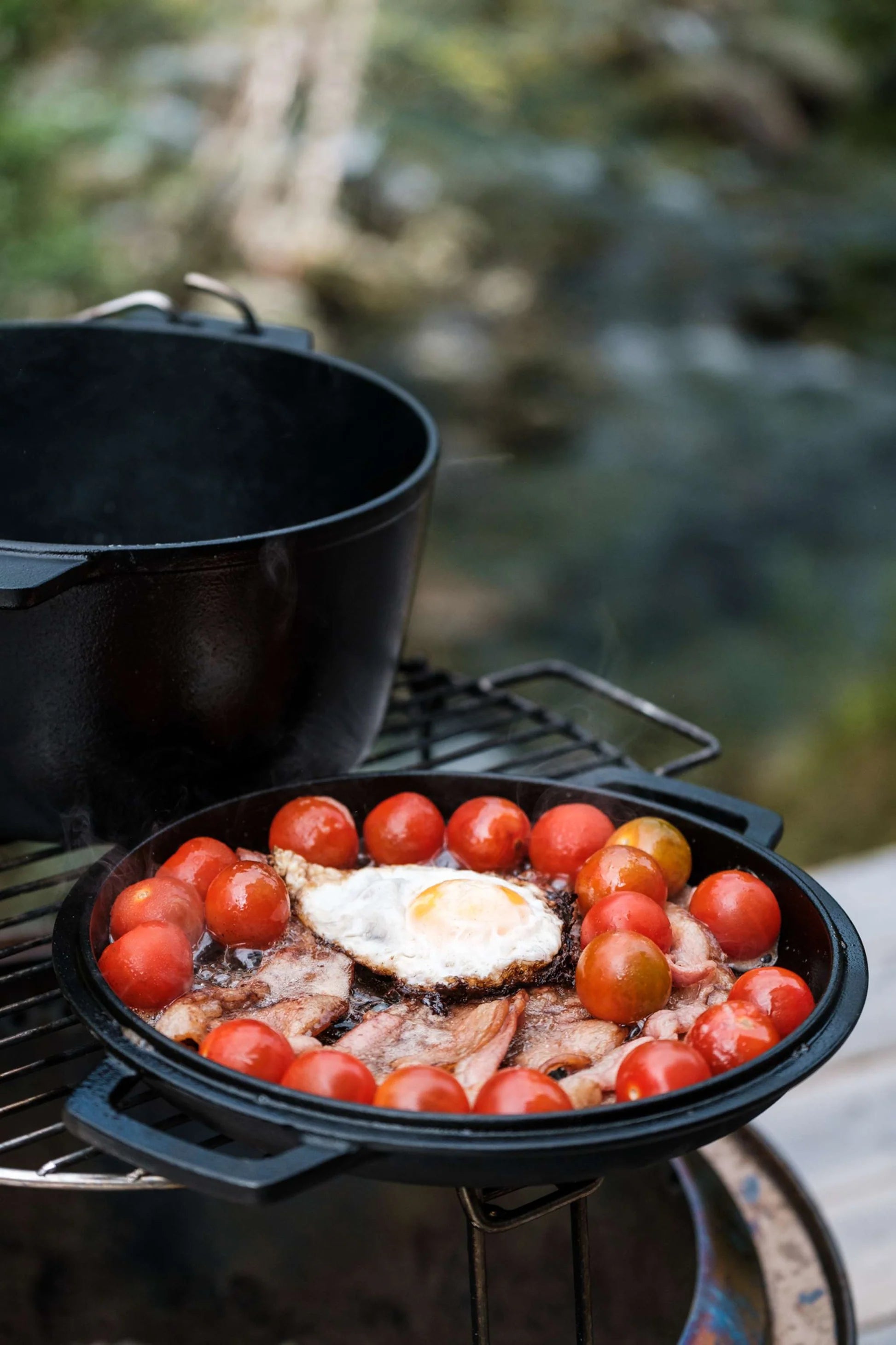 Deze handige Espegard Gietijzeren Pannenset bestaat uit een koekenpan, een kookpot en een deksel. De pan heeft een stevig, gietijzeren handvat met handige schenktuit, ideaal voor sauzen of het afgieten van vet. De pot heeft gietijzeren handvaten en kan eenvoudig boven open vuur gehangen worden. Het deksel heeft twee handvatten en kan ook dienen als grillplaat dankzij de ribbels aan de onderkant. Samen met de pot fungeert het deksel als een 'Dutch Oven': leg er wat gloeiende kolen boven en je bakt als in een echte oven.