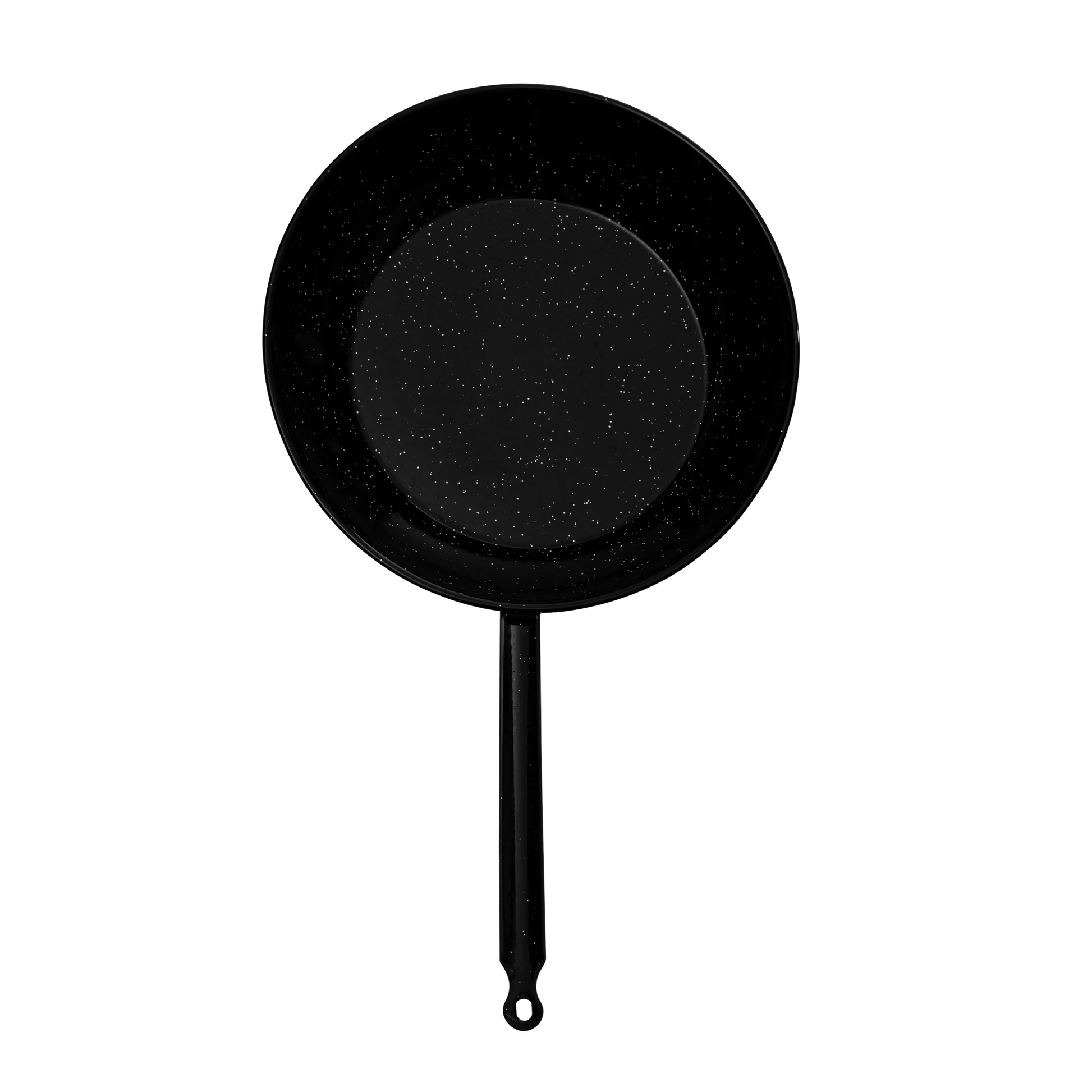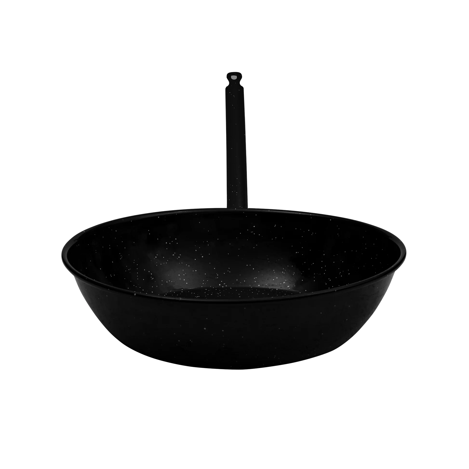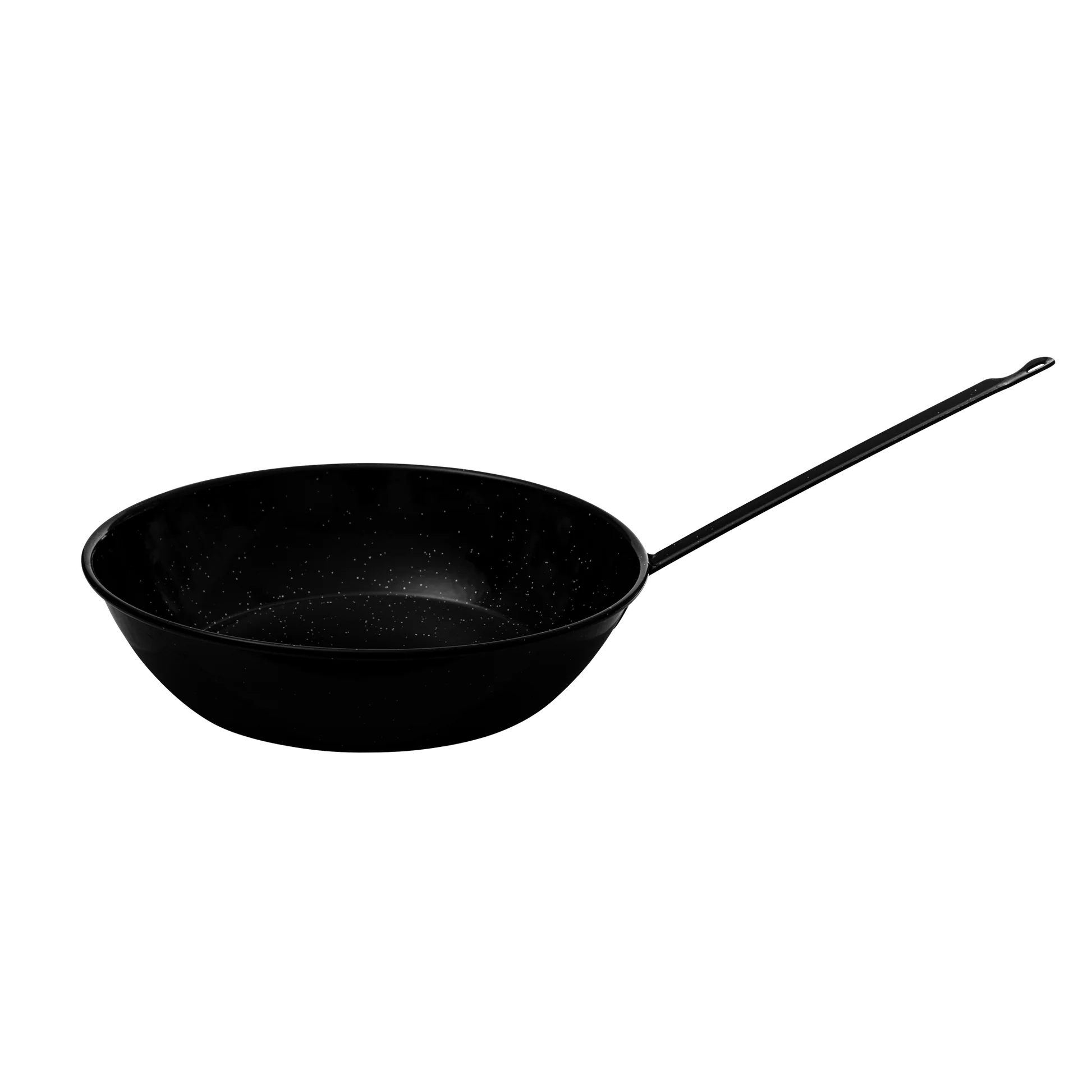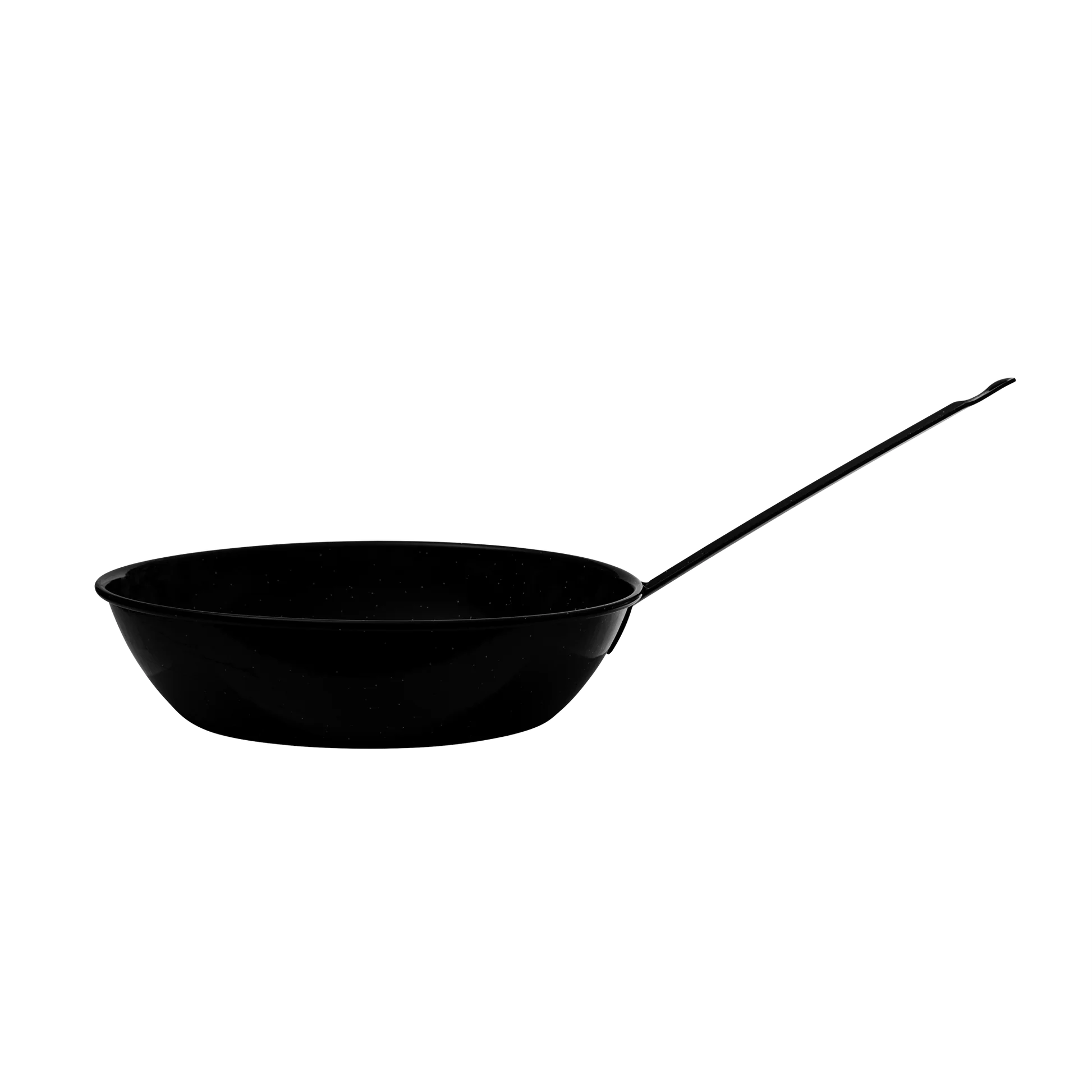 Grote pan van zwart geëmailleerd staal met een lang handvat voor veilig en comfortabel gebruik. Perfect voor koken boven open vuur. Bestand tegen hoge temperaturen.