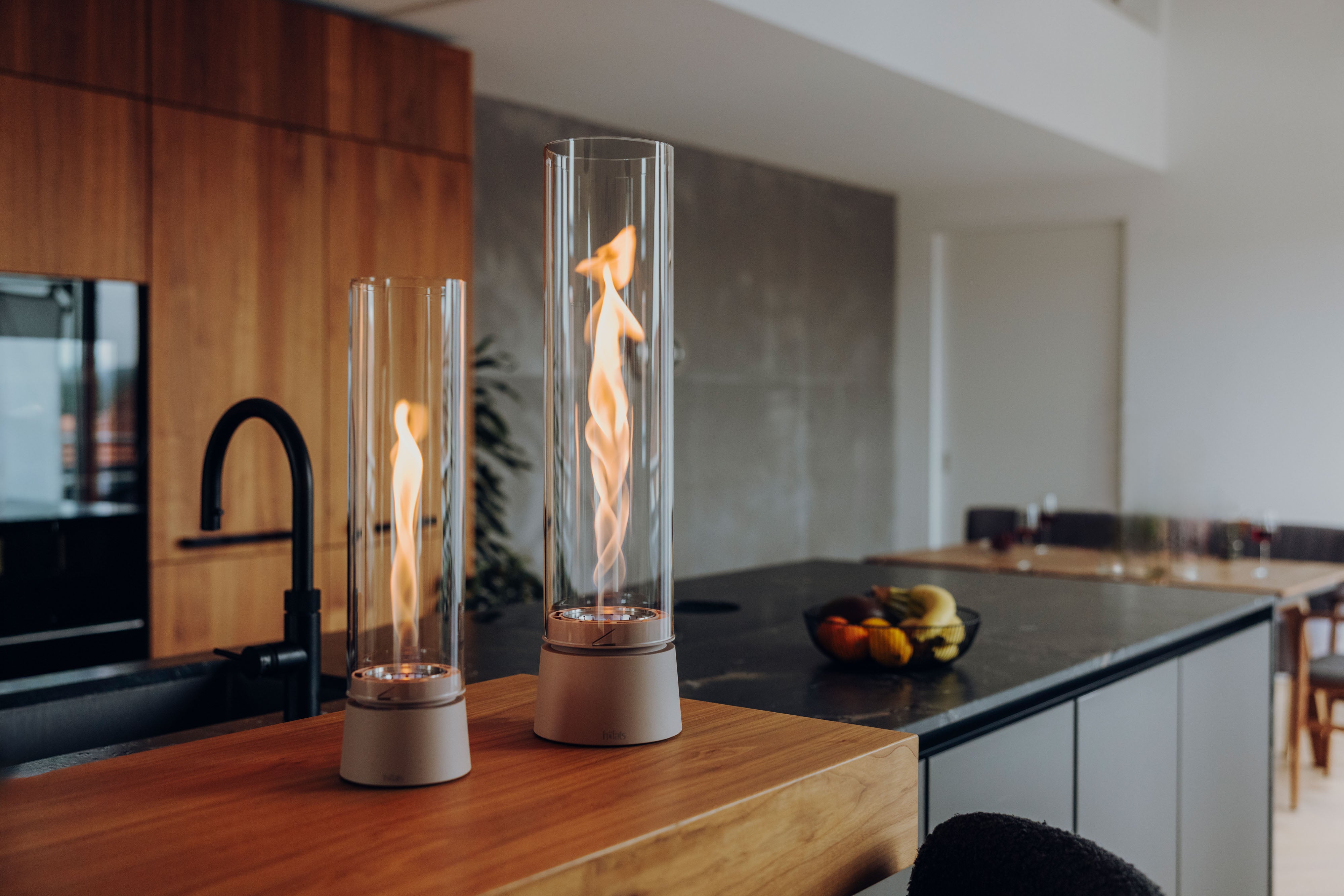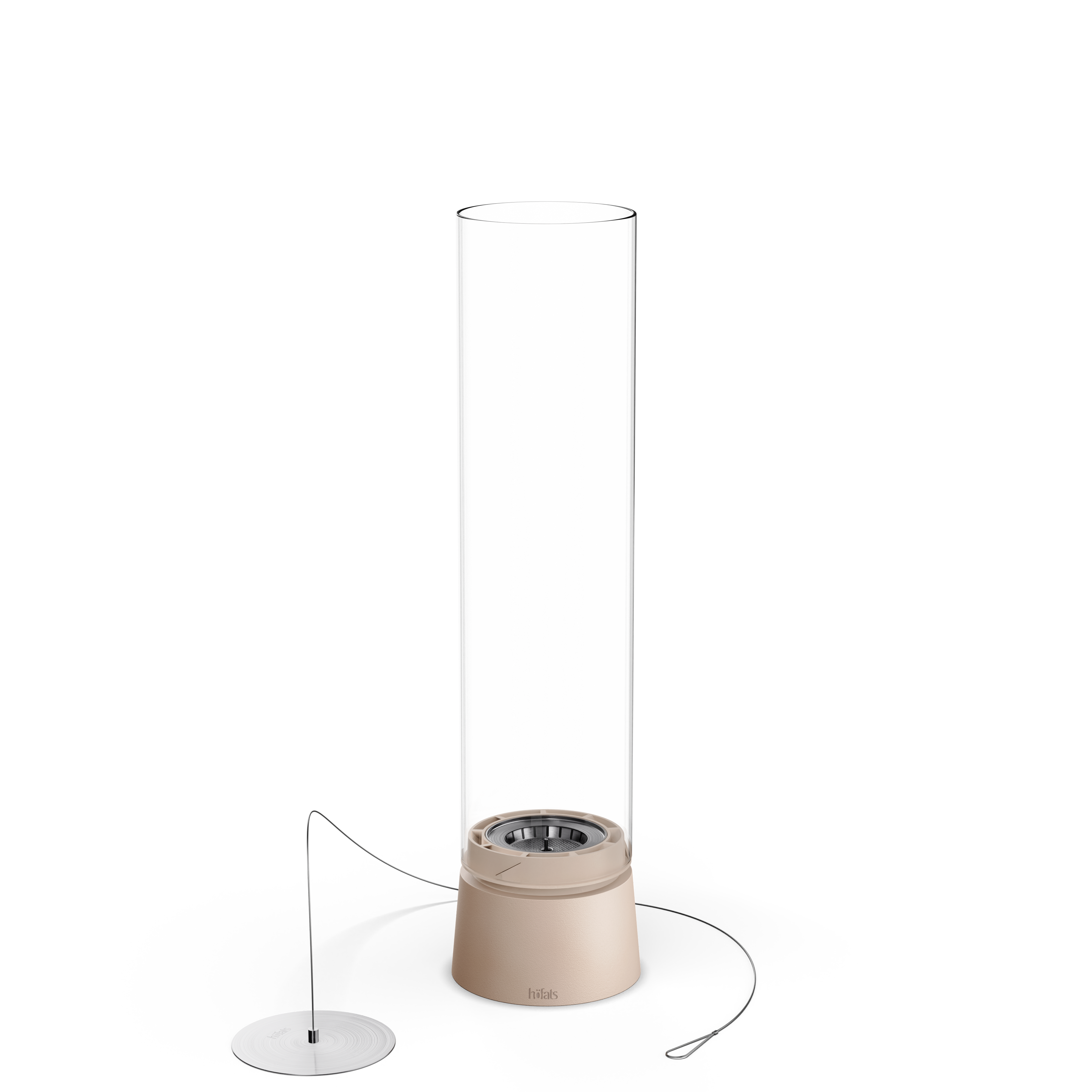 Basis met zandkleurige afwerking, vleugelbehuizing met veiligheidscontainer, Bio-Burner met afneembare Eco-Ring, blusdeksel, glazen cilinder